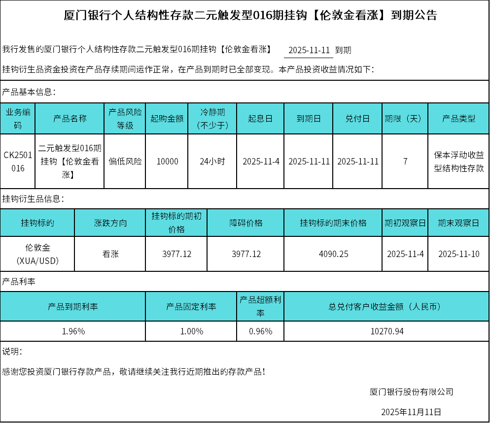廈門銀行個人結(jié)構(gòu)性存款二元觸發(fā)型016期掛鉤【倫敦金看漲】到期公告